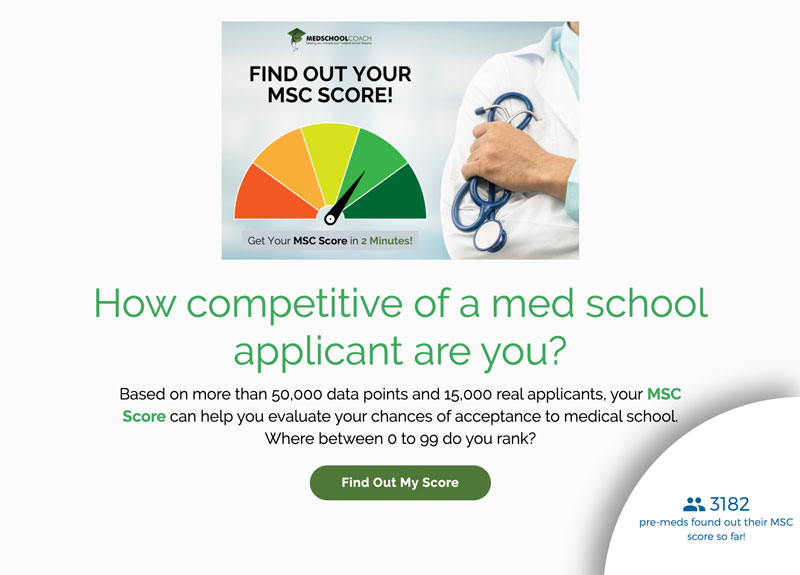 All premed students have an MSC Score that identifies how competitive a medical school applicant they are. MedSchoolCoach built this calculator by drawing upon thousands of data points from real medical school applicants. The result? Now students can now determine their likelihood of acceptance into medical school. And elite students can learn how to stay ahead of the competition from other top universities.